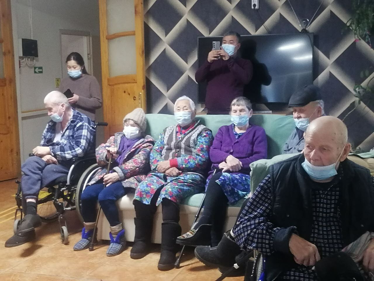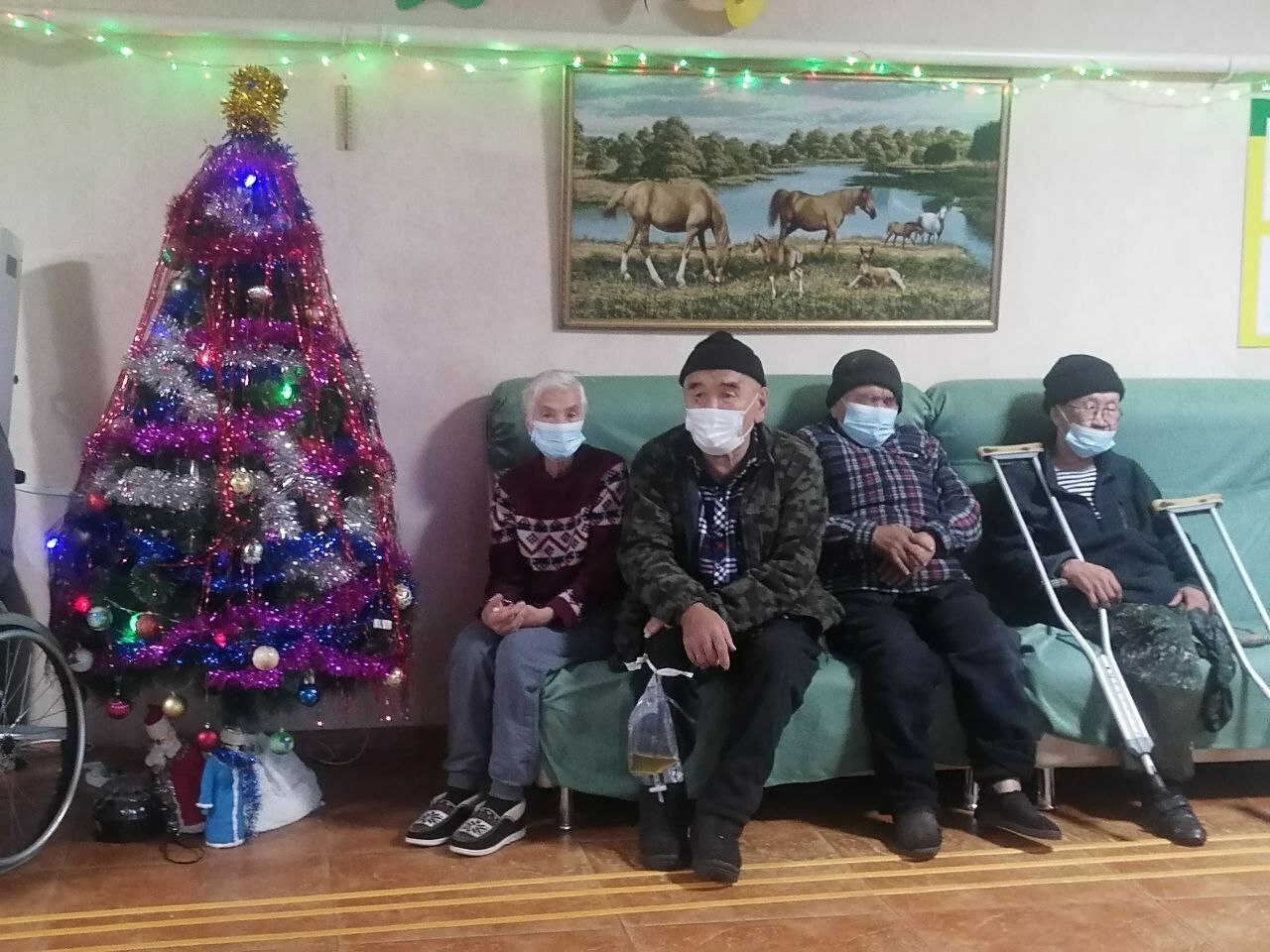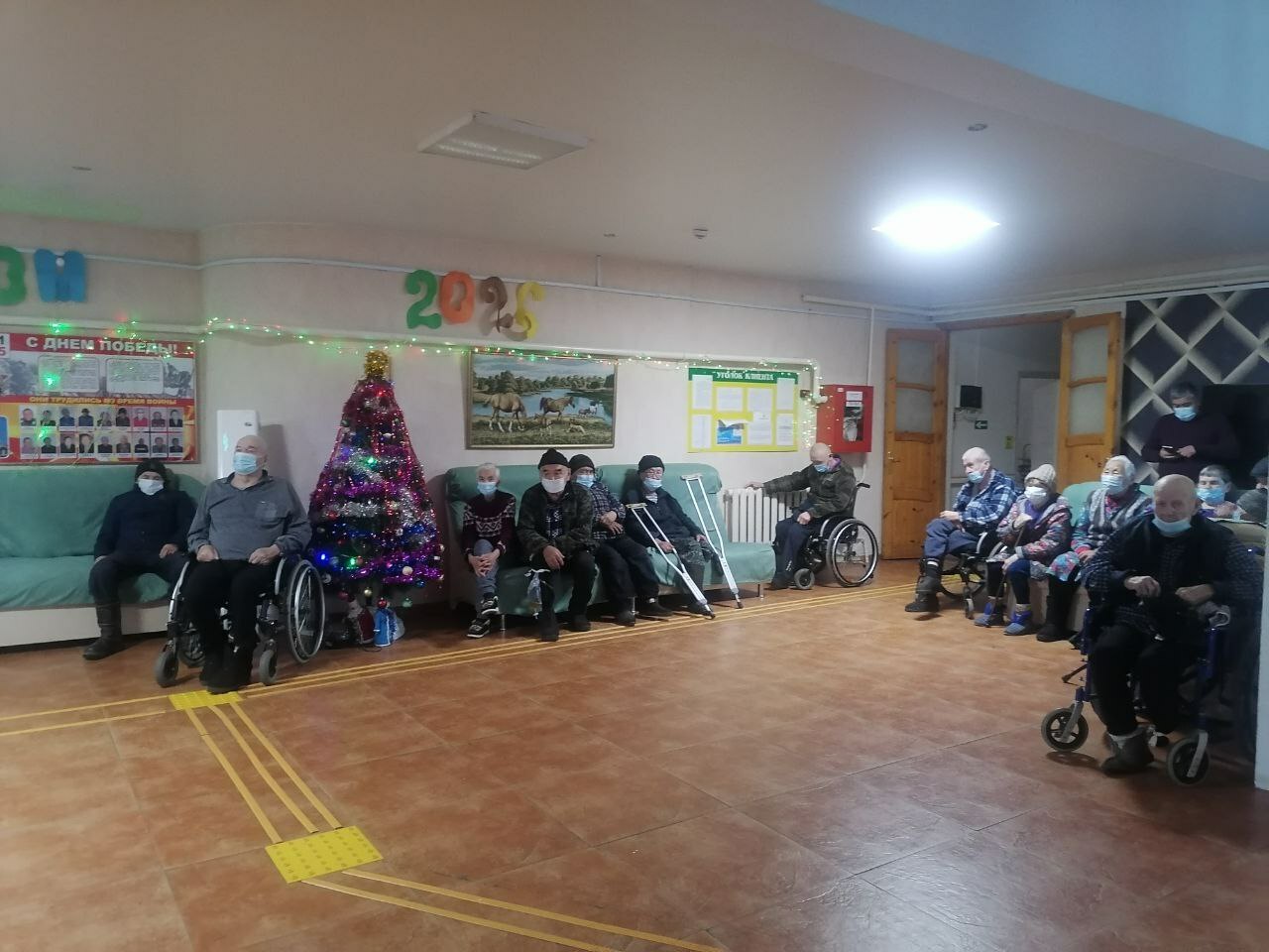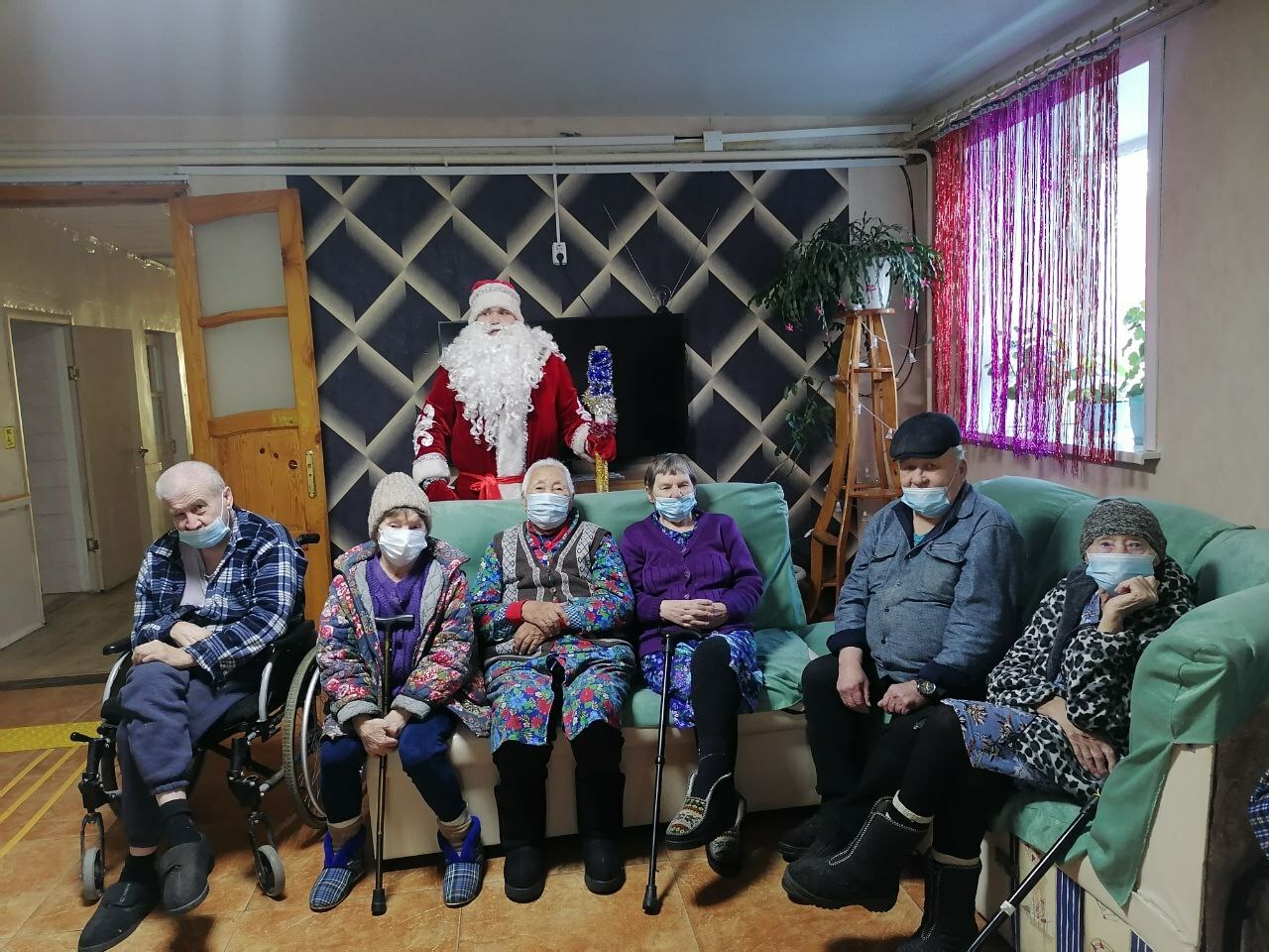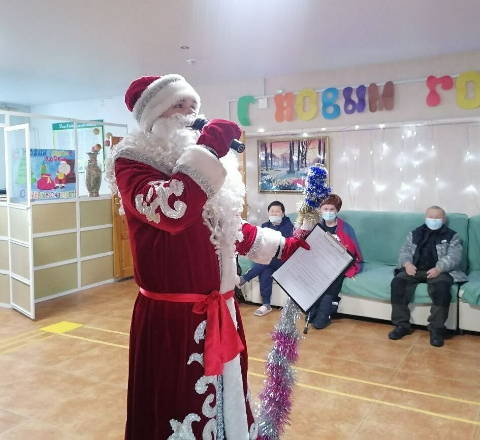 Гости устроили праздничный концерт с песнями, стихами и словами благодарности в адрес ветеранов вместе с Дедом Морозом.