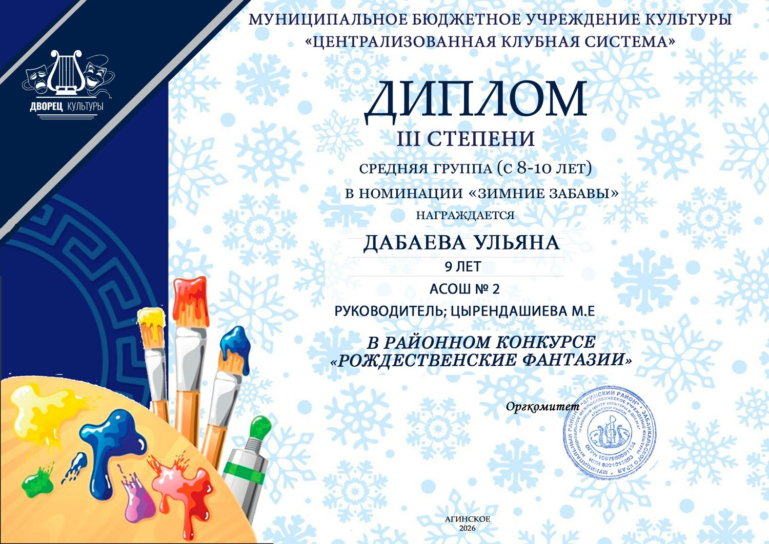 6. Дабаева Ульяна 9 лет, АСОШ2, 3Д кл, Рук-ль: Цырендашиева М.Е. Диплом 3 степени