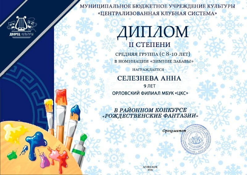 6.Селезнева Анна, 9 лет «Рождество» Орловский филиал МБУК "ЦКС". Диплом 2 степени