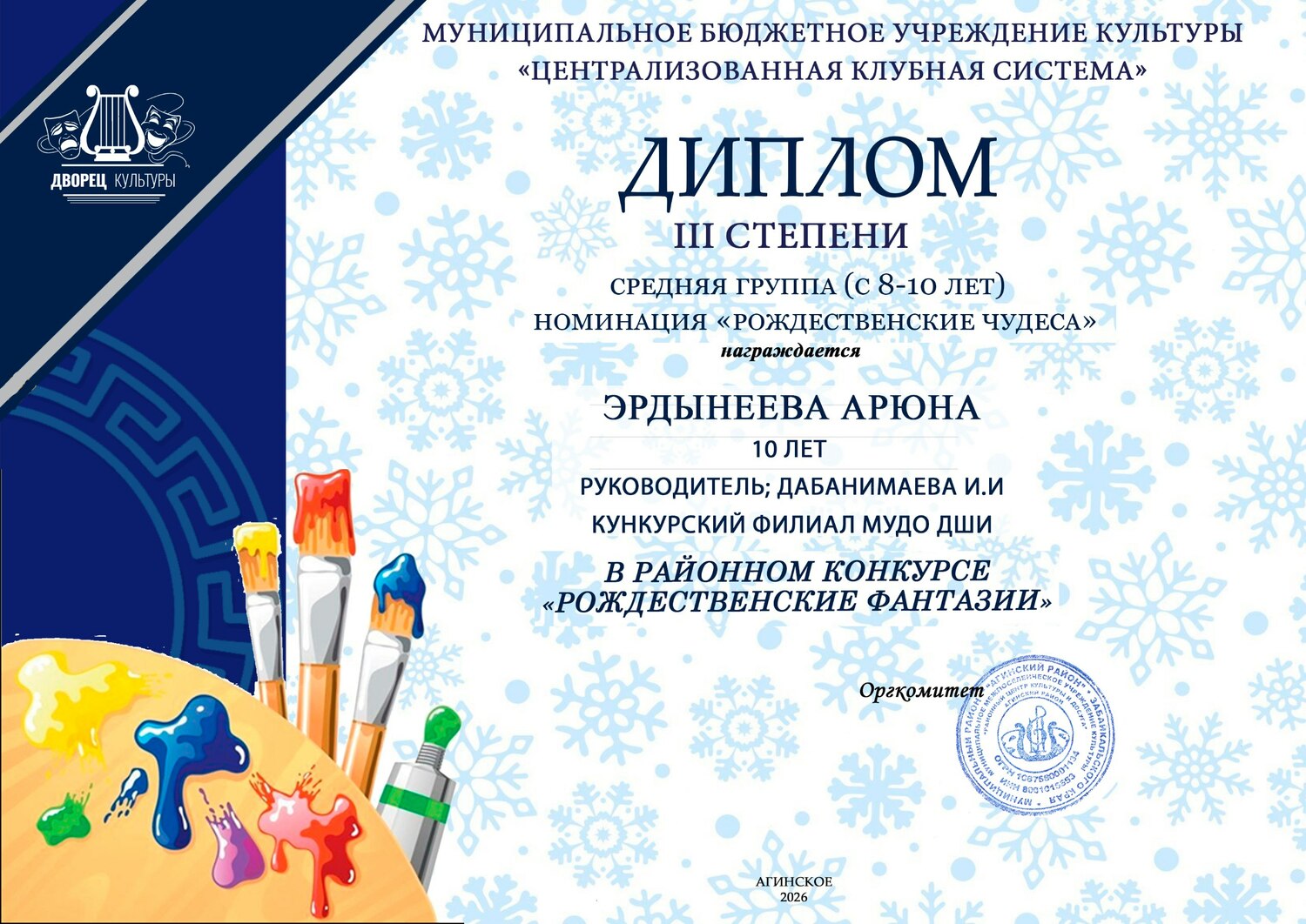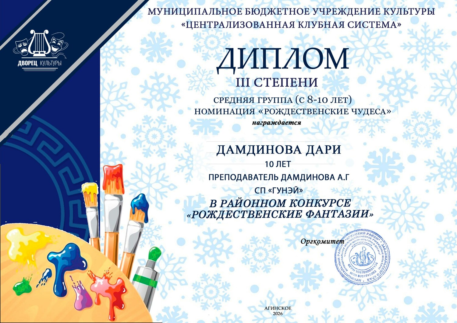 1.Дамдинова Дари , 10 лет, 5 класс, село Гунэй. Диплом 3 степени