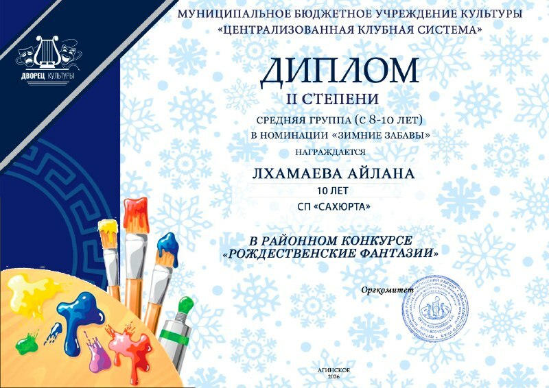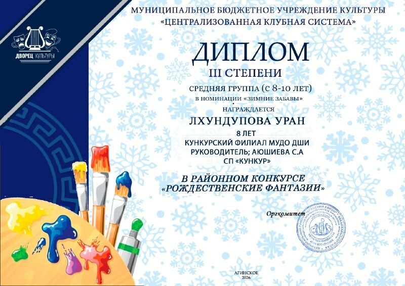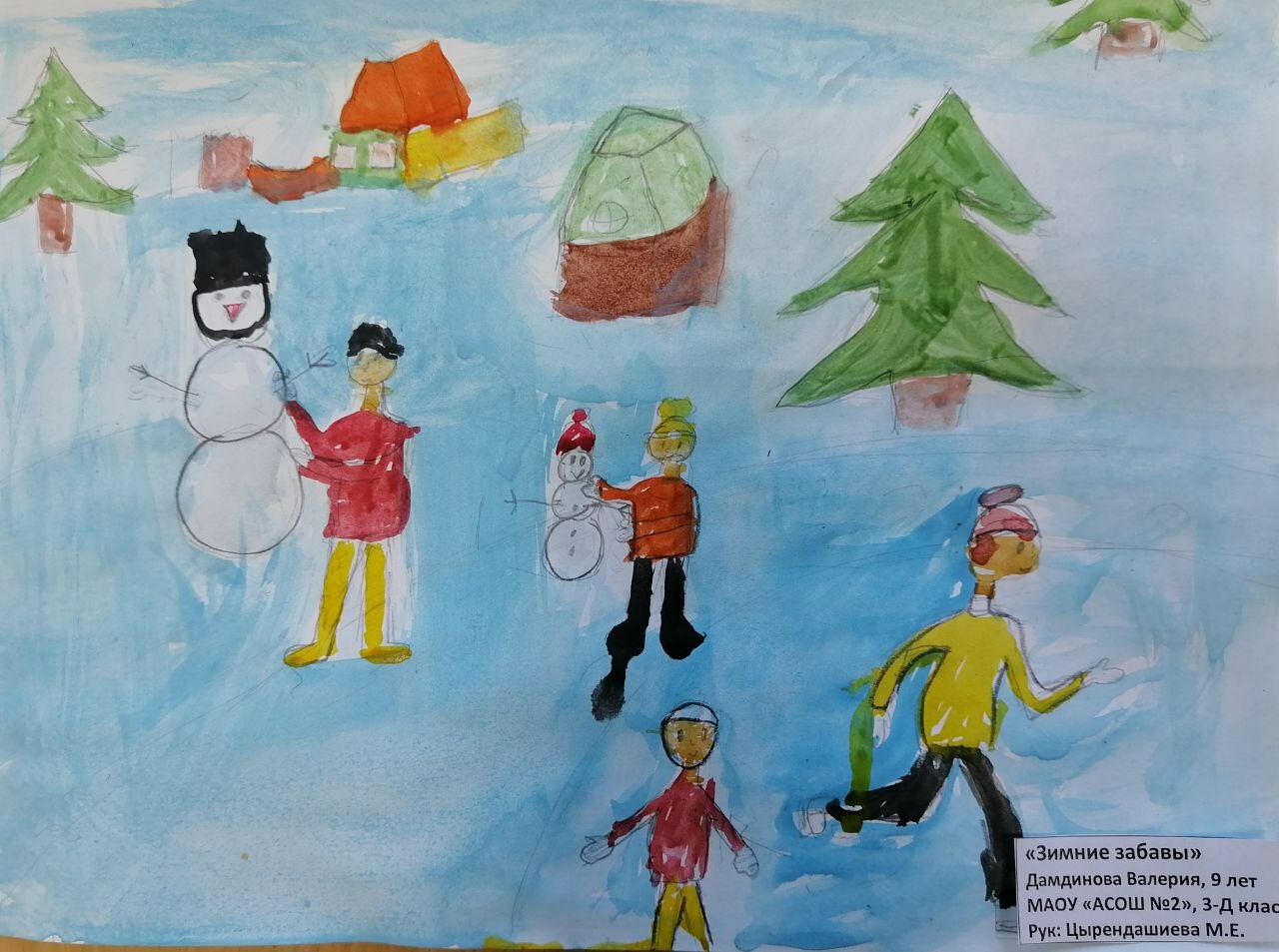 7.Лхундупова Уран 8 лет, рук-ль: Аюшиева С.А. «Снеговик и дети» Кункурский филиал МУДО ДШИ им.К.И.Базарсадаева. Диплом 3 степени