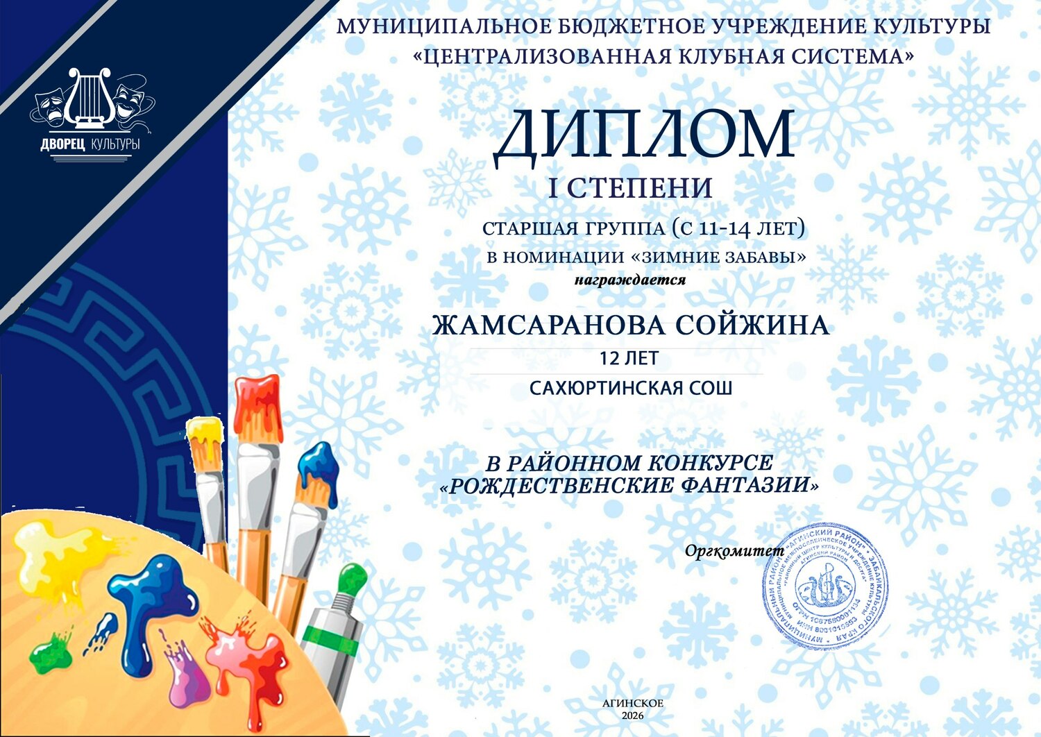 1. Цыденова Дыжит 11 лет, Сахюртинская СОШ. Диплом 2 степени