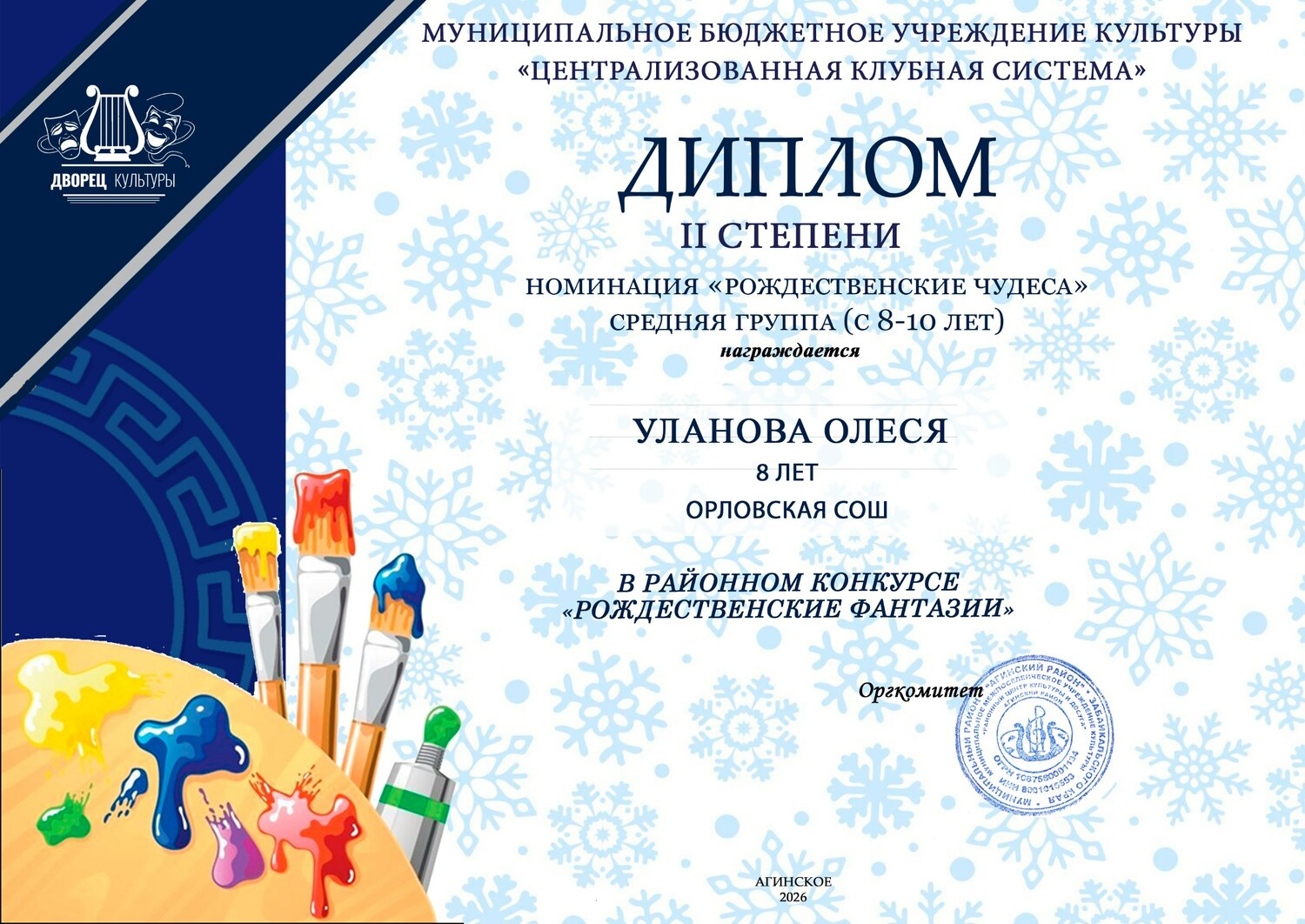 4.Уланова Олеся 9 лет, Орловская СОШ «Снигирь». Диплом 2 степени