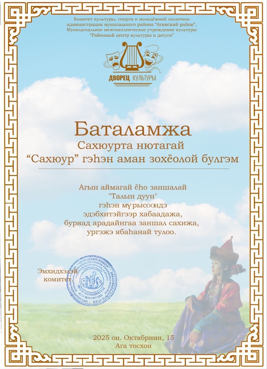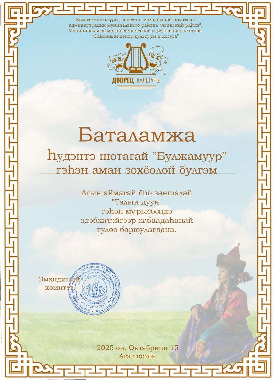 15 октября прошёл конкурс фольклорных коллективов "Талын дуун". Районный фестиваль берет начало с 2013 года. Имеет богатую историю и незыблемые традиции по сохранению и трансляции бурятской культуры.