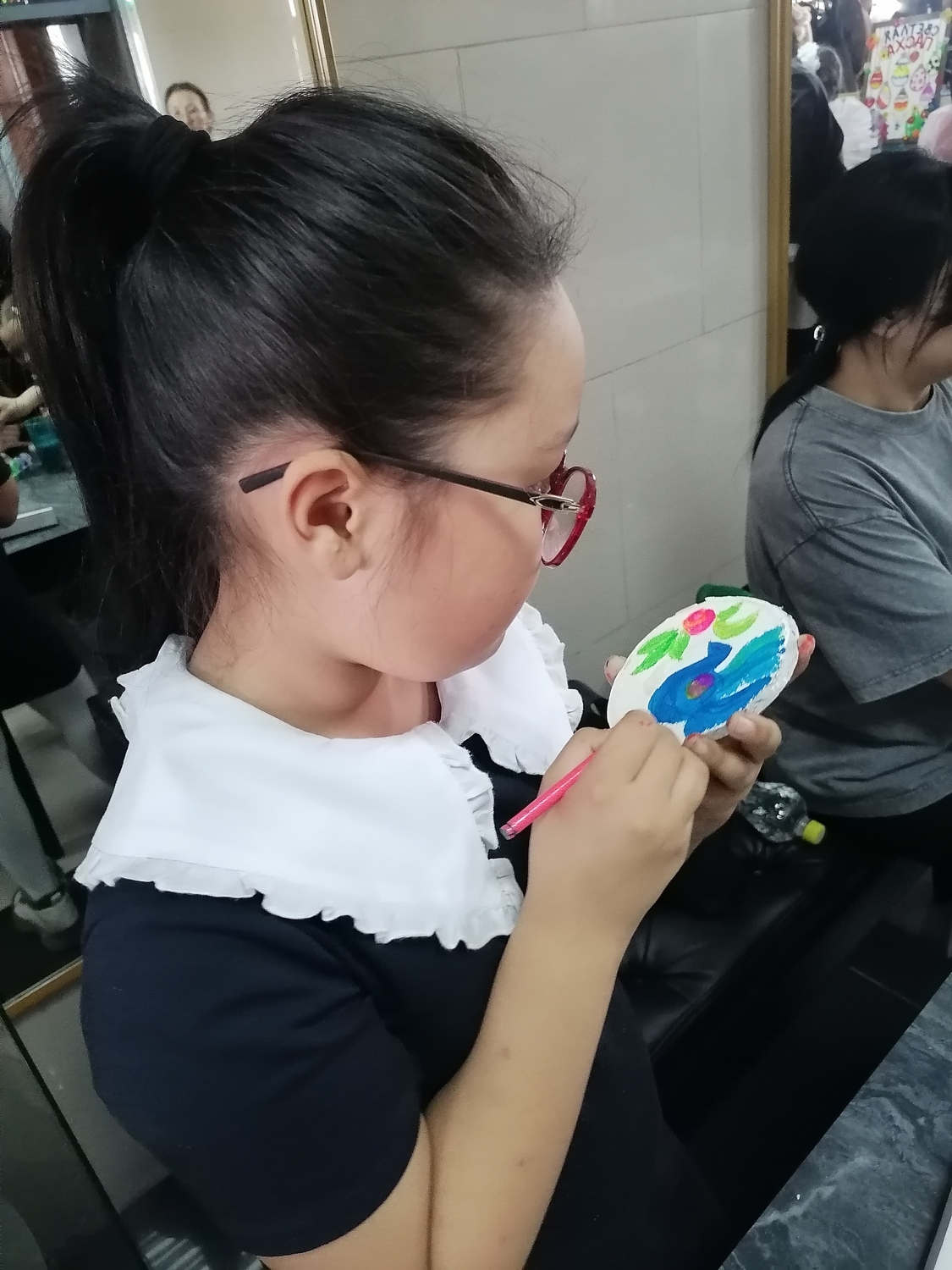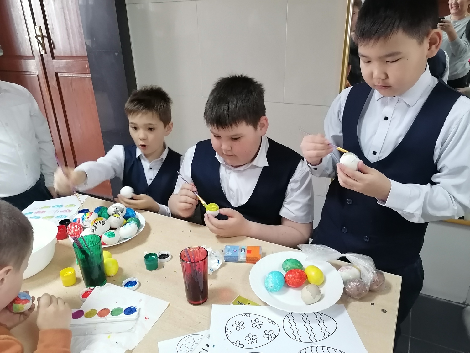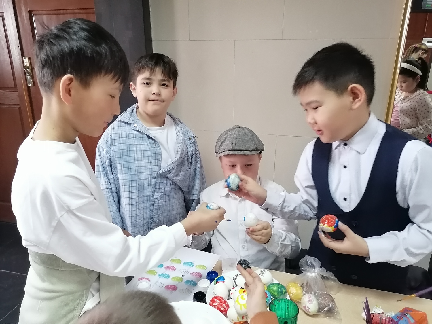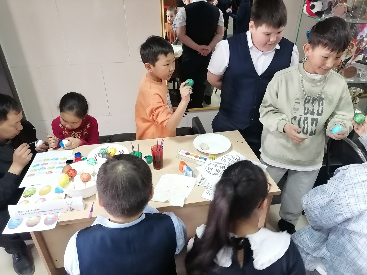 Ребята с удовольствием разбрелись по мастер классам: одни увлечённо красили пасхальные яйца, другие осваивали искусство мыловарения, создавая тематические фигурки, а третьи учились делать объёмные открытки.