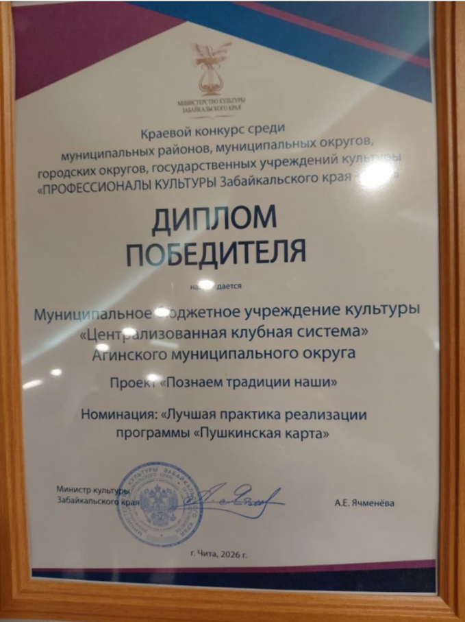 По итогам года в номинации «Лучшая практика реализации программы «Пушкинская карта» удостоен наш проект «Познаём традиции наши» МБУК "ЦКС".