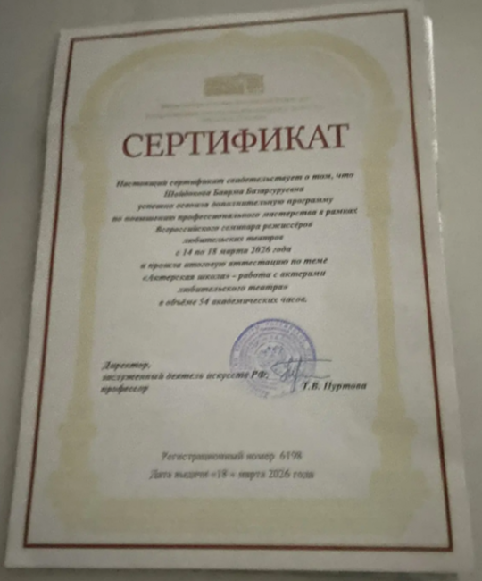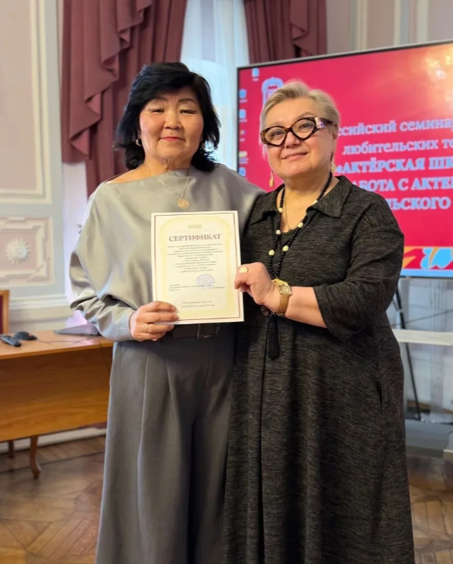 В финале курса, организованного специалистами отдела театрального искусства и детского художественного творчества ГРДНТ им. В.Д. Поленова, участники получили сертификаты о повышении профессионального мастерства, среди них Баярма Шойдокова (Цокто - Хангильский народный театр).