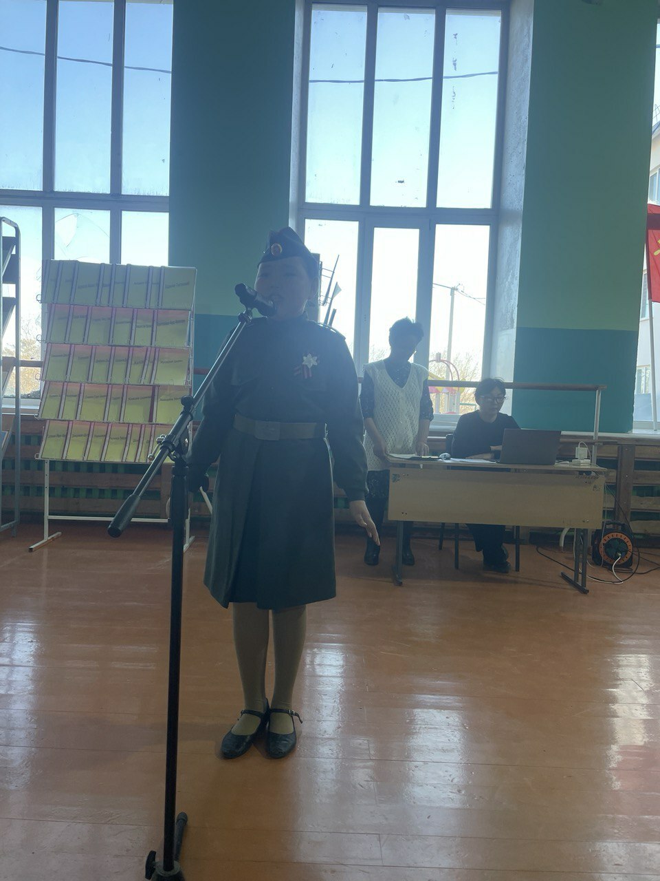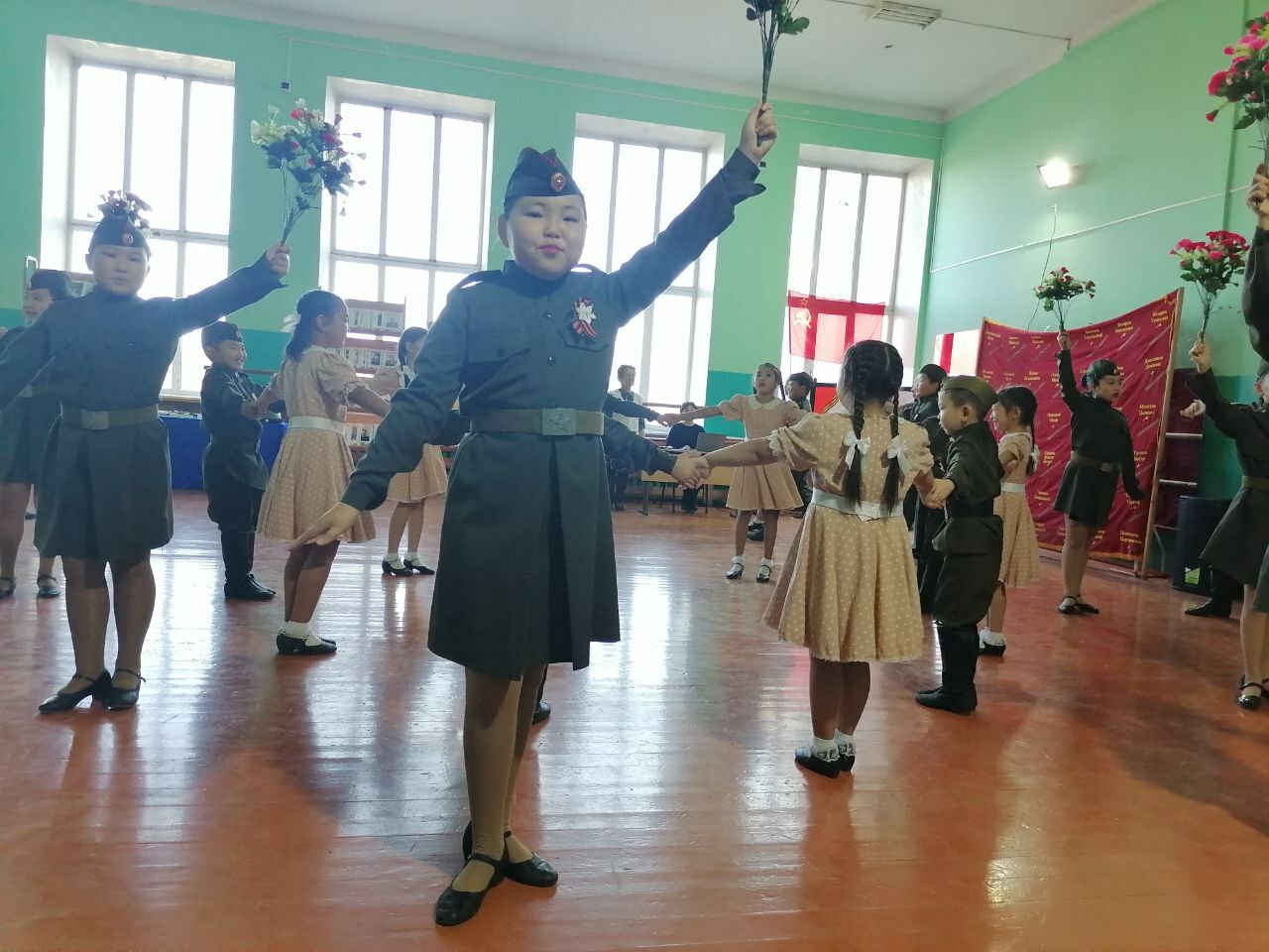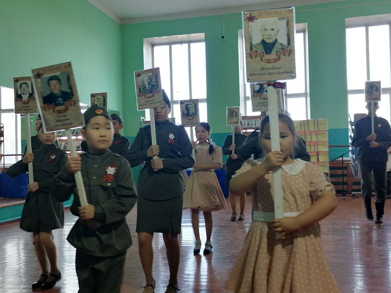 В программе приняли участие учащиеся АСОШ, народный самодеятельный ансамбль "Улаалзай". Дети читали стихи, прошлись маршем с портретами Бессмертного полка.